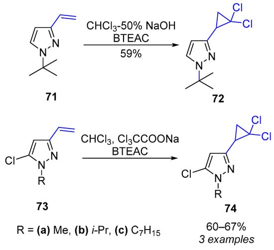 Furthermore, 3-vinylpyrazoles 71 react with dichlorocarbene, generated from chloroform or sodium trichloroacetate, to afford new cyclopropylpyrazoles 72 [77], which are interesting precursors of bisheterocycles such as 5-(pyrazol-4-yl)isoxazolines. Popov and coworkers synthesized 1-t-butyl-3-(2,2-dichlorocyclopropyl)-1H-pyrazole 72 by reaction of vinylpyrazole 71 with chloroform and sodium hydroxide under PTC. The reaction was carried out at 60 °C (10 min), and compound 72 was obtained in 59% yield (Scheme 27). The reactions of 1-alkyl-5-chloro-3-vinyl-1H-pyrazoles 73a–c under analogous conditions did not afford the target dichlorocyclopropane derivatives. In fact, 1-alkyl-5-chloro-3-(2,2-dichlorocyclopropyl)-1H-pyrazoles 74a–c were obtained in good yield only when dichlorocarbene was generated under neutral conditions, by thermal decomposition of sodium trichloroacetate in chloroform in the presence of benzyltriethylammonium chloride (BTEAC) as PTC (Scheme 27) [77].