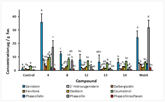 Isoflavonoid phytoalexin accumulation in hypocotyl-root of common bean (P. vulgaris L. cv. ICA Cerinza) in response to indanoyl-derivative treatment 72 h post-induction. Bars show the mean concentration of isoflavonoids ± s.d. (n = 3). For each compound, bars with different letters (a–d) are significantly different (p < 0.05; Fisher’s LSD test).