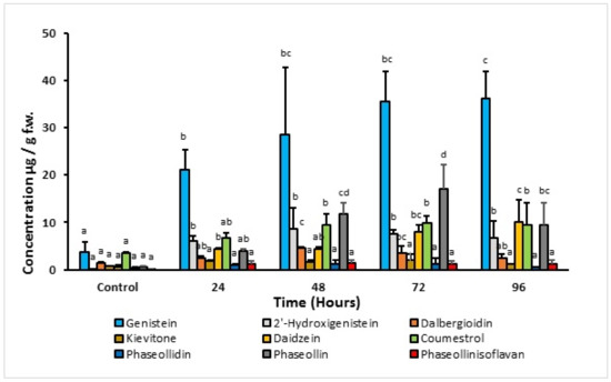 It is observed that the concentration of phytoalexins increases significantly with post-induction time compared to the control (Figure 6). During the first 48 h, in ICA Cerinza, maximum concentrations were detected for the isoflavones 2′-hydroxygenistein (9.0 μg/g) and the isoflavanone dalbergioidin (5.1 μg/g), after which the accumulation of the isoflavone and the isoflavanone decreased. Consequently, the concentration of coumestrol and pterocarpan-type phytoalexins increased, reaching maximum levels after 72 and 96 h post-induction, respectively. In ICA Cerinza, the maximum concentration of phaseollin (17.2 μg/g; 39 times higher than in the control) and coumestrol (9.8 μg/g) was reached at 72 h post-induction. Similar results were found in the cultivar Uribe Rosado; in particular, the maximum concentration of phaseollin (21.0 μg/g; 6.5 times higher than in the control) and coumestrol (15.9 μg/g; two times greater than in the control) was reached after 72 and 96 h post-induction, respectively. The amount of kievitone remained almost constant (below 5.0 μg/g) during the period of analysis for both cultivars.