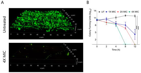 (A) Fluorescence micrographs of SYTO9/PI stained untreated and 4X MIC99 treated (CABI-6) S. aureus biofilms. (B) Ability of CABI-6 potential to clear the S. aureus biofilms is confirmed by dose-dependent and time-dependent changes in CFUs. Data was analysed by ANOVA (**** p < 0.0001).