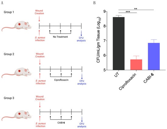 Since S. aureus is associated with skin infections, we examined the potential efficacy of CABI-6 against a murine wound infection model. On BALB/c mice, we made 1 cm2 circular wounds and infected them with S. aureus cells. We divided the mice into three groups (five mice per group) after 18 h of infection, and group 1 was assigned as untreated (Figure 5A). Group 2 mice were given ciprofloxacin (40 mg/kg), while group 3 animals were given CABI-6 (40 mg/kg) at the infection site. Treatments were given three times a day for three days. After the completion of the experiment, we removed the skin tissue, homogenized it, plated it on agar plates, and counted the colony forming units. CABI-6 therapy resulted in >1.5 log fold decrease in CFUs compared to the untreated control group (Figure 5B). These findings suggest that CABI-6 is effective against S. aureus-mediated wound infection.