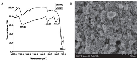 The characteristics of MMIP ((A). FTIR; (B). SEM).
