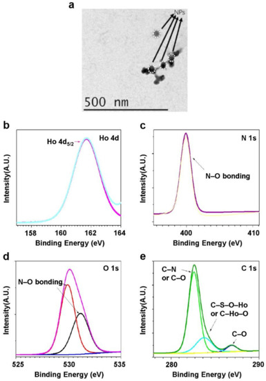 High-resolution XPS scanning spectroscopy was carried out for studying the bonding information of the synthesized nanoparticles. Ho 4d, C 1s, N 1s, and O 1s spectra of Ho-oxide compound are clearly seen in Figure 2b–e. The XPS spectra of Ho 4d (Figure 2b) show a peak at 161.62 eV, which is corresponding to Ho 4d 5/2 core level in the Ho-based compound [33,34]. The binding energy of pure Ho 4d is 161.8 eV. The chemical bonding of Ho–O or Ho–O–C–N makes it shift to 161.62 eV [35,36]. The C 1s spectra present three peaks at 282.59 eV, 283.79 eV, and 286.88 eV. The peak at 282.59 eV is assigned to C–N or C–O bonding. The peak at 283.79 eV is considered C–N–O–Ho or C–Ho–O bonding. The peak at 286.88 eV is attributed to C–O bonding [37]. N 1s spectra reveal a peak at 399.89 eV, which is attributed to N–O bonding [38]. O 1s spectra show peaks at 529.92 eV and 531.13 eV, which are considered as N–O bonding [38]. XRD was also applied to study the crystal structure of the materials (see Figure S1 of Supplementary Materials for phase indexing and lattice parameters). Other material characterization results such as energy dispersive X-ray and ultraviolet-visible spectroscopy can be found in other articles [29,39].