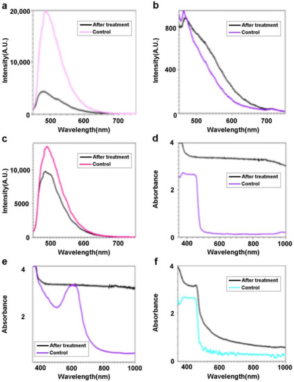 Optical absorption spectroscopy is applied to examine the impact of photodegradation (Figure 7d–f). Before photodegradation treatment, the absorption spectrum of FSS shows an absorption band around 378 nm–457 nm (Figure 7d). After treatment, this absorption band disappears. An absorption band around 523 nm–669 nm is shown in the absorption of R6G before photodegradation treatment (see Figure 7e). Similarly, after photodegradation treatment, the band is eliminated. The absorption band of Dye 1 (see Figure 7f) shows an absorption band around 382 nm–460 nm before photodegradation treatment. After photodegradation treatment, this band is reduced. The change of the fluorescence and the absorption indicates the degradation of the dyes, i.e., FSS and R6G. It should be noted that Dye 1 is the mixture of FSS and R6G. It is interesting to find out that it can be degraded by the nanoparticles.