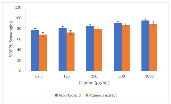 DPPH antioxidant assay of the leaf was accomplished as per the standard method of Cho et al., 2002 [35], with certain modifications. DPPH solution was prepared and kept in the dark at room temperature for 24 h. Further, sample solution was prepared by dissolving 5 mg crude extract in 5 mL methanol (90%). The obtained solution was diluted to 5 different concentrations, i.e., 62.5, 125, 250, 500 and 1000 µg/mL. Approximately 1 mL of each solution was mixed properly with 2 mL DPPH and the mixtures were kept in the dark for 30 min at room temperature. Absorbance of each mixture was checked at 517 nm. Standard ascorbic acid was used for quantification and percent activity was determined by the following formula: