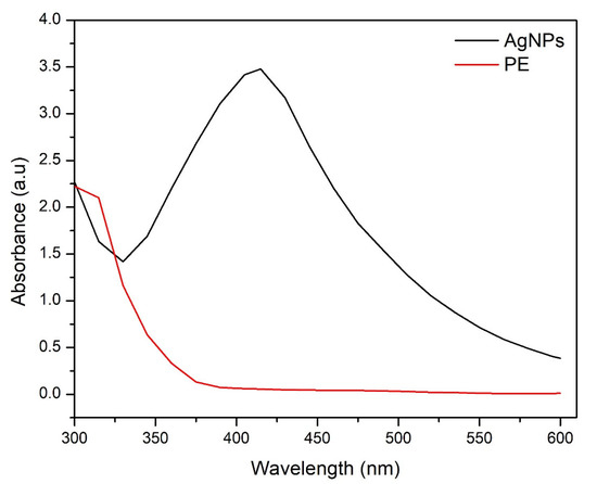 For the biosynthesis of silver nanoparticles, 1.25 mg/mL plant extract was mixed properly with 4 mM silver nitrate in different volumetric ratios (1:9 to 9:1) as per standard protocols [37,38]. The prepared mixtures were exposed to sunlight for 15 min to observe the color change. The mixtures were incubated for 24 h following exposure to sunlight. After spectroscopic analysis, mixture with appropriate optical characteristic was selected for centrifugation and washing. For separation of silver nanoparticles, the prepared solutions were centrifuged at 14,000 rpm for 15 min. The supernatants were discarded and the settled materials were dissolved in deionized water and were centrifuged again to remove unreacted reactants and impurities. This process was repeated three times to obtain pure and washed silver nanoparticles (AgNPs). Following the final step of washing, the supernatants were pipetted out and the Eppendorf tubes (1.5 mL) with AgNPs pellets were kept open for 24 h at room temperature to obtain dried AgNPs. The dried AgNPs were later characterized through various physical techniques. To prepare plant-extract-coated silver nanoparticles (AgNPs-PE), the dried AgNPs were re-immersed in 1.25 mg/mL plant extract and air dried.