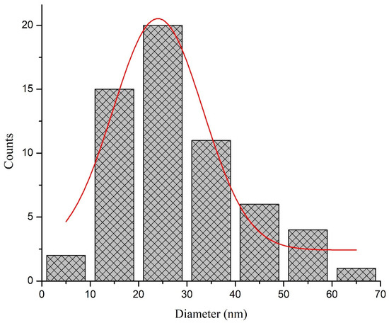The TEM micrographs of biosynthesized silver nanoparticles showed round and spherical-shaped silver nanoparticles (Figure 5). The size of the synthesized nanoparticles ranged from 20 to 60 nm, with an average size of 24 nm. The TEM images showed aggregates of particles; however, these were not in direct contact. Moreover, the SAED pattern records Bragg reflection rings equivalent to the crystalline nature of silver nanoparticles. The size distribution histogram is presented in Figure 6.