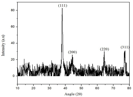 The crystalline nature of AgNPs was confirmed through XRD analysis, where 2 θ values were taken on the X-axis and corresponding intensities were taken on the Y-axis (Figure 8). The crystalline nature of the synthesized AgNPs was patterned using XRD analysis in the range of 10° to 80° at a 2θ diffraction angle. The four diffraction peaks at ~38°, ~45°, ~65° and ~78° were attributed to the crystalline planes 111, 200, 220 and 311, respectively. The XRD study showed the cubic crystal shape with an average crystallite size of 32 nm (according to the Debye–Scherrer equation) of the synthesized silver nanoparticles.