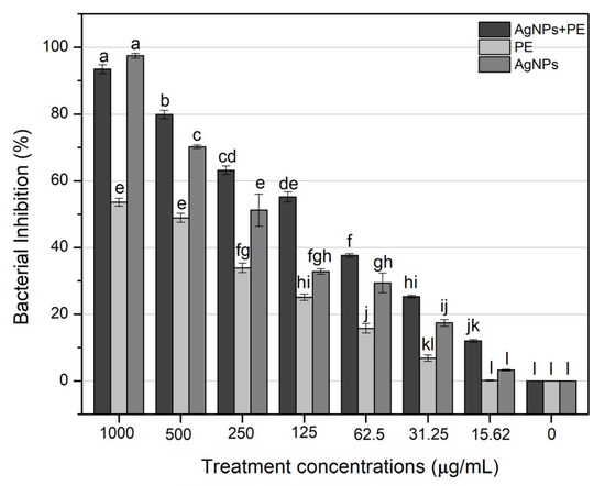 Biosynthesized AgNPs (AgNPs and AgNPs-PE) were investigated for their antibacterial efficiency against Xanthomonas axonopodis using microtiter plate assay [40]. Briefly, the antibacterial activity was performed by using 96-well microtiter plate with varying concentrations (1000 µg/mL, 500 µg/mL, 250 µg/mL, 125 µg/mL, 62.5 µg/mL, 31.25 µg/mL, 15.62 µg/mL) of washed silver nanoparticles (AgNPs), plant extract (PE) and plant-extract-coated silver nanoparticles (AgNPs-PE). Distilled water was used to prepare 1000 µg/mL of dried AgNPs, AgNPs-PE and plant extract. Lower concentrations of each treatment were prepared with distilled water by 2-fold serial dilution method. Pure culture of X. axonopodis was obtained from Department of Plant Pathology, University of Peshawar. The culture was refreshed on nutrient agar 2–3 times by incubation at 28 °C for 36 h each time. Following growth on nutrient agar, cultures were established in nutrient broth and incubated at 28 °C overnight in shaker incubator at 200 rpm. For antibacterial assay, the OD of bacterial suspensions was adjusted as OD (600) = 1. To make a total volume of 300 µL in each well of microtiter plate, 150 µL of bacterial suspension was mixed with 150 µL of each treatment concentration and the plates were placed in shaking incubator at 28 °C and 200 rpm. Control treatment used in the experiment consisted of bacterial cells without nanoparticles or plant extract. Each treatment was replicated three times and the optical density was recorded at 600 nm at 0 h and 24 h time points. The growth inhibition pattern of the bacterial cells was calculated by using the formula: