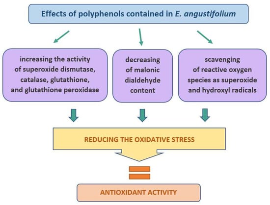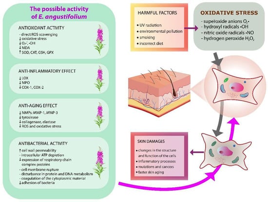 The possible effect of E. angustifolium on skin damage due to oxidative stress occurring. Bioactive compounds contained in E. angustifolium have an antioxidative, anti-inflammatory, anti-aging, as well as antibacterial potential. UV radiation, environmental pollution, smoking, or an incorrect diet may enhance the phenomenon of oxidative stress, which may result in changes in the cells’ structure and function, increase inflammatory processes, mutations, and cancerogenesis, or result in faster skin aging.