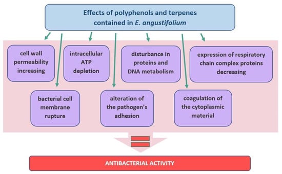 A diagram showing schematically the mechanism of antibacterial activity of the ingredients contained in E. angustifolium.