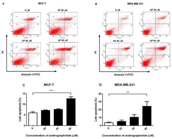 Andrographolide induced apoptosis in MCF-7 and MDA-MB-231 cells. MCF-7 and MDA-MB-231 cells were treated with different concentrations of andrographolide (20, 40, and 60 μM) for 48 h. (A,C) Apoptosis of MCF-7 and (B,D) MDA-MB-231 cells was assessed by flow cytometry analysis using Annexin V-FITC and PI staining. Data were mean ± SEM compared with the control from four independent experiments (n = 4). ** p < 0.01, *** p < 0.001 vs. control.