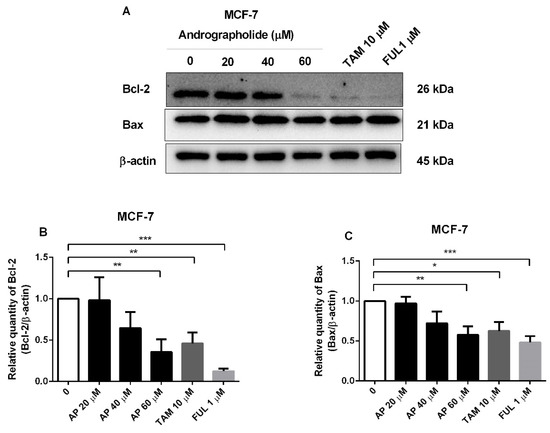 The protein expression of apoptotic proteins in MCF-7 cells was reduced by andrographolide, tamoxifen, and fulvestrant. (A) MCF-7 cells were treated with different concentrations of andrographolide (20, 40, and 60 μM), tamoxifen (10 µM), and fulvestrant (1 µM) for 48 h. The protein levels of (B) Bcl-2 and (C) Bax were determined by Western blot analysis. Data were mean ± SEM compared with the control from 4 independent experiments (n = 4). * p < 0.05, ** p < 0.01, *** p < 0.001 vs. control.