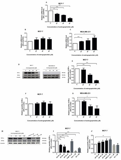 Andrographolide suppressed the expression of ERα in MCF-7 cells and induced the expression of ERβ in MDA-MB-231 cells at the mRNA level and andrographolide suppressed the expressions of estrogen receptors in MCF-7 at the protein level. The mRNA levels of (A) ERα and (B,C) ERβ were determined by qRT-PCR. (D,H) Immunoblot represents the protein expression of ERα and ERβ in MCF-7 and MDA-MB-231 cells. The protein levels of (E,I) ERα, and (F,G,J) ERβ were determined by Western blot analysis. Data were mean ± SEM compared with the control from 3 independent experiments (n = 3). * p < 0.05, ** p < 0.01, *** p < 0.001 vs. control.