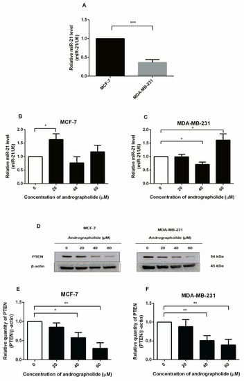 Andrographolide affected miR-21 expression and downregulated PTEN protein expression in MCF-7 and MDA-MB-231 cells. (A) The relative miR-21 expression of MCF-7 and MDA-MB-231 cells were determined by qRT-PCR. (B,C) MCF-7 and MDA-MB-231 cells were treated with different concentrations of andrographolide (20, 40, and 60 μM) for 48 h. (D) The protein expression was determined by Western blot analysis. (E,F) The protein levels of PTEN. Data were mean ± SEM compared with the control from 4 independent experiments (n = 4). * p < 0.05, ** p < 0.01, *** p < 0.001 vs. control.