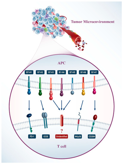 Several ligands from the B7 family have been found on tumor cells in the tumor microenvironment (Figure 1). The B7-H1 and B7-DC expression are increased on the surface of many human tumor cells of different histology and anatomic location simultaneously with the rise of the PD-1 receptor expression on T-lymphocytes [15]. Furthermore, in some cases, the expression of B7-H1 is related to the late stage of cancer and reduction of the lifetime [16]. Expression of the B7-H3 gene is found in several types of cancers such as melanoma [17], glioma [18], lung cancer cells [19], pancreas [20], kidneys [21], intestine [22], ovarian [23], mammary glands [24], and gastric cancer [25]. The relationship between the expression of B7-H3 and clinical-pathological parameters has been found in the types of cancers. However, the molecular mechanism which regulates B7-H3 expression and function in tumors is still unclear. B7-H4 is also expressed on breast cancer cells, renal cancer, ovarian carcinoma, pancreatic cancer, brain cancer, and lung cancer [26,27,28,29]. B7-H5 is expressed on cancer cells, such as pancreatic cancer cells [30]. B7-H6 is expressed on types of human cancer cells such as leukemia, lymphoma, melanoma [31], astrocytomas [32], neuroblastoma [33], gliomas [34], epidermoid cancer of the oral cavity, gastrointestinal cancer [35], breast cancer, and ovarian cancer [36]. It is not expressed on normal tissues, and B7-H6 expression is activated by transforming normal cells into cancer cells. The B7-H7 expression is found in different types of human cancer cells such as gastrointestinal and genitourinary cancers [37].