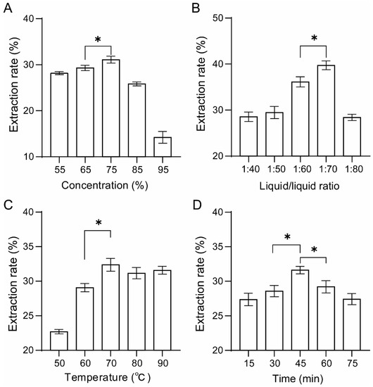 Effects of different extraction conditions on the single-factor extraction rate of FPCS. (A) Ethanol concentration. (B) Solid/liquid ratio. (C) Extraction temperature. (D) Extraction time. An asterisk (*) indicates statistical significance at p < 0.05.