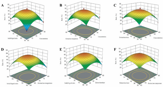 The 3D response surface (RSM) analysis of the extraction rate of FPCS, showing the interactive effects of parameters including (A) Solid/liquid ratio and ethanol concentration. (B) Extraction temperature. (C) Extraction time. (D) Solid/liquid ratio and temperature. (E) Solid/liquid ratio and time. (F) Extraction time and temperature.