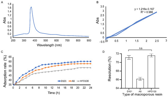 Analysis of the adsorption of macroporous resin. (A) The UV-vis spectrum of FPCS showing an absorbance peak at 370 nm. (B) Linear regression of pigment concentration and adsorbance at 370 nm. (C) Adsorption rate of D101, A8 and HPD100 macroporous resins. (D) Higher desorption rates of D101 and HPD100 than A8 macroporous resin.