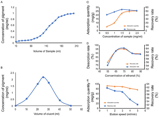 Having determined the appropriate loading and elution volumes for FPCS, the eluent concentration and elution rate were analyzed by single-factor analysis. The elution rate was determined by comprehensively considering the production cycle and recovery rate. After purification by D101, the yield of FPCS was 5.73%, and the color value was 29.41. The color value of the pigment increased nearly three-fold after purification. In the low mass concentration range, the resin adsorption capacity and recovery rate increased with increasing the FPCS concentration up to a concentration of 1.50 mg/mL, at which the resin reached its maximum adsorption capacity, remaining essentially unchanged thereafter (Figure 4C). However, when the FPCS concentration was greater than 1.50 mg/mL, recovery decreased because the sample concentration exceeded the adsorption saturation point of the resin. Together, the results suggest that an initial FPCS concentration of 1.50 mg/mL is appropriate. It is known that compounds such as polyphenols and compounds with glycosidic bonds show a weak polarity in aqueous solutions and are easy to elute from macroporous resins using ethanol [41]. We found that the amount of ethanol was critical: at a volume fraction of ethanol ≤ 75%, both the desorption rate and the recovery rate gradually increased, while at a volume fraction > 75% ethanol, there was a downward trend in the recovery rate (Figure 4D). An elution rate of 1.0 mL/min gave the best pigment recovery rate, with higher flow rates resulting in decreased desorption and recovery rates (Figure 4E).