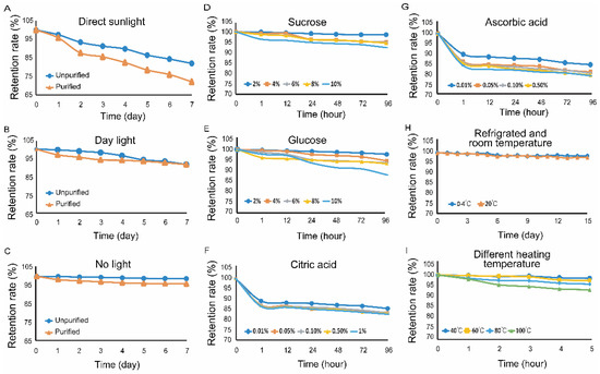 Stability of purified and unpurified FPCS. (A) Retention rate of the purified pigment after one week of sunlight irradiation. (B) The retention rates of purified and unpurified pigments after one week of natural light irradiation. (C) The retention rates of purified and unpurified pigments after storage in the dark. (D) The effect of different concentrations of sucrose on the stability of FPCS. (E) The effect of different concentrations of glucose on the stability of FPCS. (F) The effect of different concentrations of citric acid on the stability of the pigment. (G) The effects of different concentrations of ascorbic acid on the stability of the pigment. (H) The retention rate of the pigment after 15 days of cold storage and at room temperature. (I) The effect of different temperatures on the stability of FPCS.