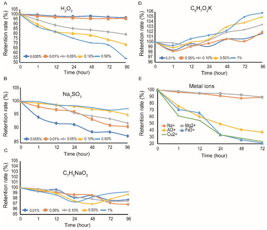 Effects of oxidants and reductants, preservatives and metal ions on the stability of FPCS. (A) The effect of different concentrations of H2O2 on the stability of the pigment. (B) The effect of different concentrations of Na2SO3 on the stability of FPCS. (C) The effect of different concentrations of sodium benzoate on the stability of FPCS. (D) The effect of different concentrations of potassium sorbate on the stability of the pigment. (E) The effect of Na+, Mg2+, Al3+, Fe3+ and Cu2+ on the stability of the pigment.