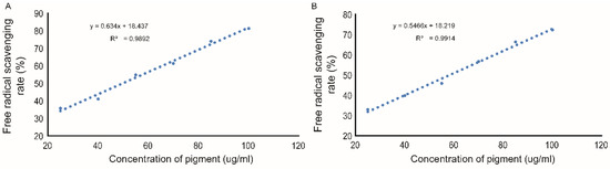 The DPPH radical clearance rates with FPCS concentrations of 25, 40, 55, 70, 85 and 100 µg/mL were 35.78%, 41.06%, 54.88%, 61.38%, 73.98% and 81.30%, respectively (Figure 7A). It can be seen from the figure that the higher the pigment concentration, the higher the scavenging rate of free radicals and the stronger the antioxidant effect. Curve fitting showed a linear relationship between DPPH radical clearance and pigment concentration in the range tested, with the formula y = 0.634x + 18.437, where R2 = 0.9892 (Figure 7A). Using this linear regression equation, it can be calculated that FPCS scavenged the DPPH free radical with an IC50 of 49.78 µg/mL.