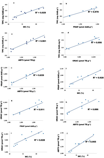 Pearson correlation coefficient between total phenolic content and antioxidant activity of crude green rooibos extracts. Total phenolic content versus antioxidant assays (a–d). Antioxidant versus antioxidant (e–j).