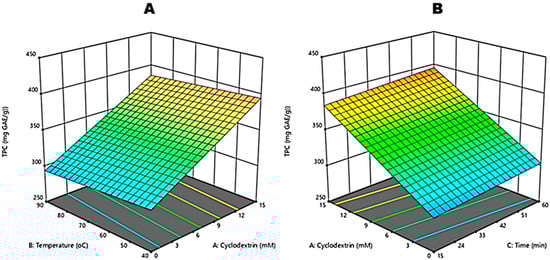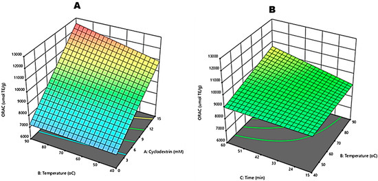 The influence of each input variable on the response value was significant, with β-CD concentration (p = 0.0001), reaction temperature (p = 0.0008) and time (p = 0.0062). The interaction between X1X2 and X2X3 between independent variables was also significant. Furthermore, a synergy between β-CD and temperature and temperature and time was observed (Table 2). The three-dimensional response surface plots depicted in Figure 7A,B can be used to illuminate the influence of interaction on the response value.