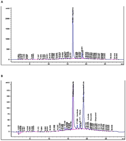 HPLC chromatograms of selected flavonoids of CGRE 15 mM: 40 °C: 60 min at 287 nm (A) and 360 nm (B).