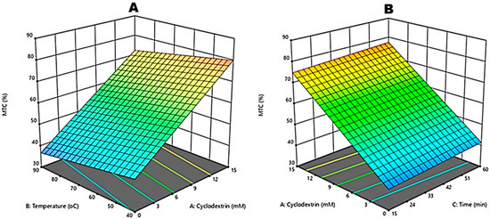 The ANOVA results presented in Table 2 indicate that the model possessed an insignificant (p > 0.05) lack of fit, and the R2 and R2adj values of the model were 0.8826 and 0.8658, respectively. Therefore, the input variables were a valid predictor of outcomes of MTC. The overall effects of the input variables on the responses were further analysed, and the results showed that β-CD (X1) and temperature (X2) significantly (p < 0.05) influenced the MTC. However, the effect of reaction time was insignificant (p > 0.05) (Table 2). Figure 4A,B shows the interaction between the independent variables and their effects on the MTC.
