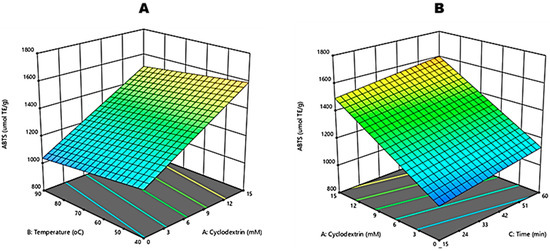 Concerning β-CD concentration, a similar trend was observed for both TPC and MTC; the increase in β-CD concentration is directly related to ABTS radical scavenging activity (Figure 5A,B). This observation agrees with results [24,27], who observed the improvement in antioxidant activity (DPPH radical scavenging) due to the better extraction with β-CD encapsulation. However, contradicting results were also reported. For instance, ref. [16] observed no significant differences (p > 0.05) in ABTS radical scavenging activity between aqueous olive pomace extracts and 7 mM β-CD extracts at 31.5 and 32.48 mg TE·kg−1, respectively. These differences can be attributed to the different kinds of polyphenols present in the different vegetable sources.