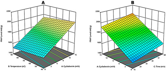 Response surface plots for independent variables for ferric reducing antioxidant power (FRAP) of crude green rooibos extracts: (A) effect of Beta-cyclodextrin and reaction temperature and (B) effect of Beta-cyclodextrin and reaction time.