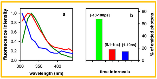 Time-resolved spectra determined for the polymeric duplex at selected time-windows are shown in Figure 2a. They were reconstructed from a series of fluorescence decays by integrating the photons emitted at each wavelength over the considered time-window; subsequently, they were corrected for the spectral response of the detection system and normalized at their maximum to better reveal spectral changes. Raw spectra are shown in the Supplementary Materials (Figure S1). The spectrum of the photons emitted from −50 to 50 ps (time-width entirely within the apparatus function) peaks at 330 nm. Between 0.1 and 1 ns, the peak shifted to 320 nm, while a weak intensity shoulder appeared around 420 nm. On the ns timescale, the emission band shifts further to the blue, the maximum likely located at wavelengths shorter than 305 nm; unfortunately, this region is unexploitable because of the Raman line of water. In parallel, the relative intensity of the shoulder located in the visible further decreases; the photons emitted in the visible range (410–440 nm) represent now only 20% of the photons emitted in the UV (305–400 nm). In fact, this percentage should be even lower taking into account that the UV part of the spectrum is truncated. The percentage of the total number of photons emitted at three successive time intervals over the ensemble of the probed wavelengths is illustrated in Figure 2b. They were obtained by integrating the numbers of emitted photons at all the probed wavelengths over the considered time-window and, subsequently, divided by the overall number of photons. The photons emitted between 1 and 10 ns represent 15% of the total and ~12% correspond to the UV band.