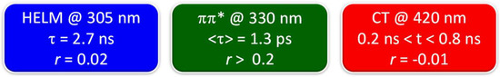 In Figure 9, we summarize the three limiting types of excited states whose emission is dominating over various probed time-domains. This is depicted in the case of the oligomeric duplex, for which transient absorption data regarding the CT states are also available. Below 10 ps, we have emission from ππ* states, whose average lifetime is 1.3 ps. Then, these states start acquiring an increasing CT character. Excited states with strong CT character emit between 0.2 and 0.8 ns, in line with the findings of transient absorption spectroscopy [6,8,50]. Finally, the longest-lived emission detected here (2.7 ns) is characterized by a smaller CT character and its major part appears in the blue side of the spectrum.