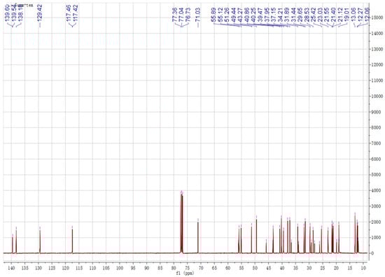 Chemical structures of the identified compounds obtained from silica gel column chromatography in experimental sections were characterized by 1H-NMR and 13C-NMR spectroscopy (Figure 1 and Figure 2). Analysis of the 1H and 13C NMR spectra of spinasterol revealed 29 carbons signals comprising six methyls (11.99, 12.27, 13.06, 18.92, 21.40, 21.12) and two double bonds (117.40, 139.54; 129.42, 138.18). An oxygen substituted CH was constructed from the H signals δH 3.60 (δC 71.03, H-3) and two protons signals (δH 5.16, overlapped; 5.04, dd, J = 15.1, 8.8 Hz) were assignable to cis-oriented double bond (C22 and C23). These results suggest that it is an ergosterol. Considering that the 13C NMR spectrum was in generally good agreement with the known spinasterol, thus the isolated compounds contained spinasterol. In the same way, another compound was identified as 22,23-dihydrospinasterol [21]. Although the purified compound was a little bit impure, mixture of these two compounds was identified as a ratio of 1:2 with the comparison of the integral areas of the double bond region. Thus, spinasterol and 22,23-dihydrospinasterol were first isolated from XYMJ and identified by our experiment.