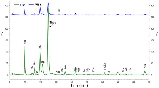 Hitachi AA analyzer report of 23 free amino acids: VIS 1 (green line) and tea samples VIS 2 (blue line). The retention time of Asp, Thr, Ser, Asn, Glu, Gln, Thea, Pro, Gly, Ala, Val, Cys, Met, Ile, Leu, Tyr, Phe, g-ABA, Trp, Orn, Lys, His, and Arg were 9.753, 14.38, 15.833, 18.253, 19.66, 21.18, 24.853, 31.747, 33.86, 35.78, 41.74, 43.147, 44.567, 47.94, 49.613, 51.267, 53.887, 61.24, 63.5, 73.213, 74.9, 77.747, and 87.16 min, respectively.