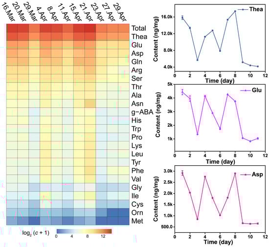Heatmap of AAs detected from XYMJ green teas and dynamic changes of Thea, Glu, and Asp plucked from March 16, March 20 (Spring Equinox), March 29, April 4 (Pure Brightness), April 8, April 11, April 15, April 21 (Grain Rain), April 23, April 27 to April 29, 2021.