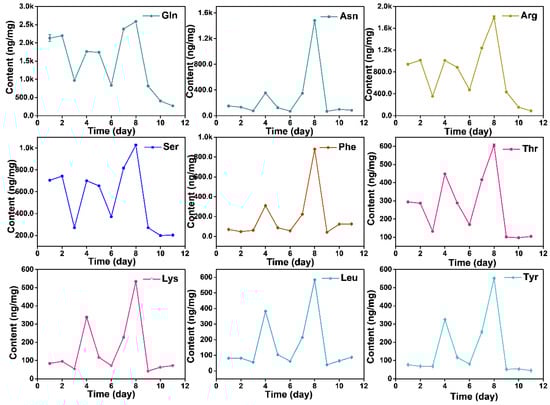 Dynamic changes of AAs (Gln, Asn, Arg, Ser, Phe, Thr, Lys, Leu, and Tyr) from March 16, March 20 (Spring Equinox), March 29, April 4 (Pure Brightness), April 8, April 11, April 15, April 21 (Grain Rain), April 23, April 27 to April 29, 2021.