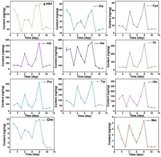 Dynamic changes of AAs (g-ABA, Gly, Cys, Val, Ala, Ile, Pro, Trp, His, Orn, and Met) from March 16, March 20 (Spring Equinox), March 29, April 4 (Pure Brightness), April 8, April 11, April 15, April 21 (Grain Rain), April 23, April 27 to April 29, 2021.