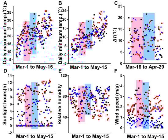 Climate conditions in 2019–2021. Black rectangle points, red dots, and blue triangles represent climatic parameters in 2019, 2020, and 2021, respectively. The red rectangles represent the period from Spring Equinox to Pure Brightness Day, and the blue rectangles represent the period from Pure Brightness Day to Grain Rain. (A) Daily maximum temperature; (B) daily minimum temperature; (C) ΔT; (D) sunlight hours; (E) relative humidity; (F) wind speed of Wulidian County of Pingqiao District, in Xinyang County, from March 1 to May 15.