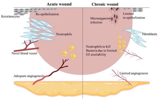 Processes active in acute and chronic wounds. Acute wounds (left side): Adequate angiogenesis with re-epithelialization promotion, fibroblasts’ proliferation, and neutrophils’ anti-infection activities. Chronic wounds (right side): Persistent local bacterial infections, failure formation of novel blood vessels. decreased fibroblasts’ proliferation, and the neutrophils’ anti-infection activities hampered by poor angiogenesis.