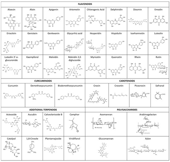 Figure 3 give a summary of the major plant-derived phytochemicals that successfully contribute to the alleviation of the inflammatory state and healing process.