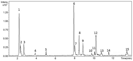 Extract of L. barbarum fruits was firstly characterized by total flavonoid and phenolic content (i.e., TPC and TFC, respectively) measurements. The TPC of the test extract was found to be 46.31 ± 1.07 mg GAE/g Edw; TFC was 26.53 ± 0.98 mg CE/g Edw. Liquid chromatography coupled with high-resolution mass spectrometry with electrospray ionization (LC-ESI-HRMS) analysis gave additional information on the chemical composition of test L. barbarum extract beyond TPC and TFC. Figure 1 presents the total ion chromatogram (TIC). Compounds were identified based on detailed scrutiny of their mass spectra using the precursor ion, fragment ions, and comparison of the fragmentation patterns with molecules described in the literature [23,25,26,27]. Table 1 summarizes the identification of these compounds, and they are numbered according to their retention times. Relative abundance (%) was also calculated based on the normalized peak intensity from the TIC. Fifteen main compounds were detected and identified, including four flavonoid glucosides (combined relative abundance (JRA) = 49.60%), a conjugated phenylpropanoid (JRA = 21.03), four free flavonoids (JRA = 9.05%), and four nitrogen-containing compounds, i.e., five hydroxycinnamic acid amides (HCAA) (JRA = 17.45%), and a lignamide (JRA = 2.87%).