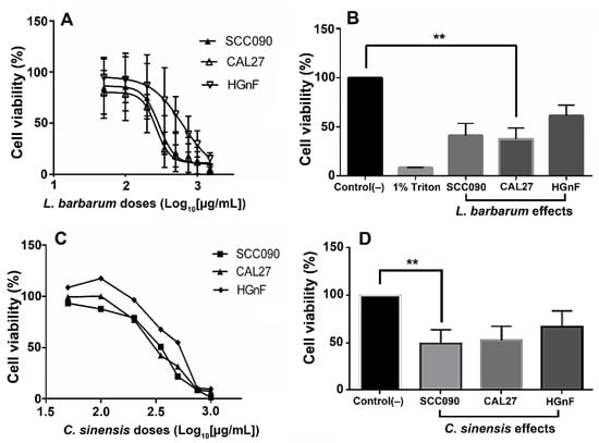 Cytotoxic activity of extracts from L. barbarum and C. sinensis on tumor cell lines SCC090, CAL27, and GHnF. Cells were treated for 48 h at different concentrations (50–1000 μg/mL). (A) IC50 curve of the effect of L. barbarum. (B) Comparison of the IC50 of L. barbarum in each cell line. (C) IC50 curve of C. sinensis. (D) Comparison of the IC50 of C. sinensis in each cell line. The results are expressed as the mean of three independent tests with their three replications (n = 3) ± standard error of the mean (SEM). Two asterisks (**) represent statistically significant differences in the extract effect regarding the control treatment (untreated cells), comparing the effect of the extract on cell lines (p < 0.05).