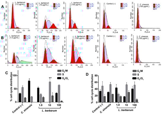L. barbarum extracts induced cell cycle arrest in SCC090 and CAL27 cells at the concentrations evaluated. Histograms for SCC090 (A) and CAL27 (B) cells in different phases of the cell cycle analyzed by the ModFit software are shown. Quantification of a cell population (in percentage) in different phases of the cell cycle is shown as bar diagrams for SCC090 (C) and CAL27 (D) cells. Results are expressed as the mean of three independent trials in triplicate (n = 3) ± standard error of the mean (SEM). The effect of the extract concerning the treatments was compared: * control (–) (untreated cells) and ** control (+) (C. sinensis extract at 100 μg/mL) (p < 0.05).