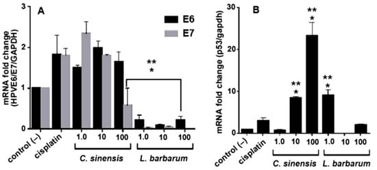 mRNA expression levels in SCC090 cells treated with extracts from L. barbarum and C. sinensis for 48 h at 1.0, 10, and 100 μg/mL. The mRNA levels were measured by reverse transcription-quantitative polymerase chain reaction (RT-qPCR): (A) E6 and E7, (B) p53. Results are expressed as the mean of three independent triplicate trials (n = 3) ± standard error of the mean (SEM). The effect of the extract was compared concerning the treatments: * control (–) (untreated cells) and ** control (+) cisplatin (p < 0.05).