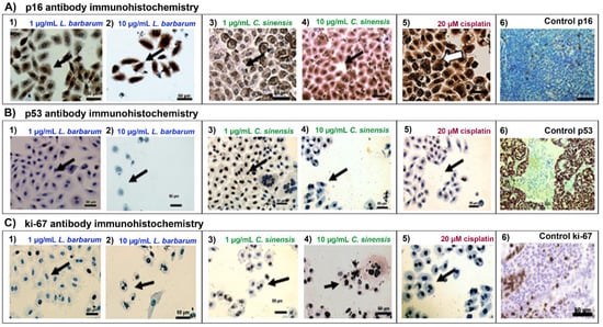 Immunohistochemical images for SCC090 cell line on evaluating the expression levels of G0/G1 and S checkpoint proteins using (A) p16, (B) p53, and (C) Ki-67 antibodies, after treating with (1) 1.0 μg/mL L. barbarum, (2) 10 μg/mL L. barbarum, (3) 1.0 μg/mL C. sinensis, (4) 10 μg/mL C. sinensis, (5) 20 μM cisplatin, and (6) negative control (no treatment). (Scale Bar 50 μm). Observations for the (A–C) × 1–6 pictures: (A1): 70% nuclear and cytoplasmic expression; (A2): intense staining and change in cell size and shape; (A3): more than 70% nuclear and cytoplasmic staining; (A4): slight change in shape and size with intense staining; (A5): more than 70% nuclear and cytoplasmic staining; (A6): cervix, showing intense staining; (B1): intermediate expression; (B2): no expression, but there was a change in the shape and size of SCC090 cells; (B3): nuclear single intermediate expression; (B4): nuclear weak expression with cell size and shape alterations; (B5): absent staining with a slight change in cell shape; (B6): gastric, showing intense staining of more than 70% nuclear and cytoplasmic; (C1): weak expression; (C2): intermediate expression and a slight change in cell morphology; (C3): weak expression; (C4): weak expression, but the cells displayed morphological changes; (C5): weak expression; (C6): amygdala, showing intermediate staining.