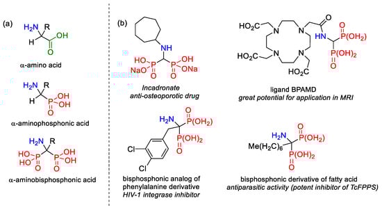(a) Comparison of the structures of α-amino acid, α-aminophosphonic acid and α-aminobisphosphonic acid. (b) Representative examples of α-aminobisphosphonates with medical applications.