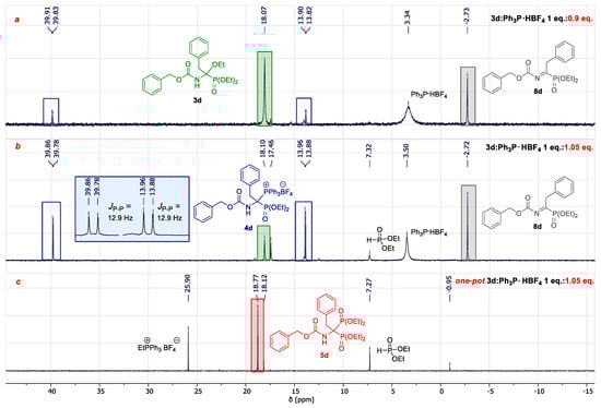 The confirmation of the proposed phosphonium salt 4 formation mechanism is illustrated in the 31P NMR spectra of the reaction mixture (Figure 2a,b), with signals belonging to α-ethoxyphosphonate 3d at approximately 18.1 ppm, Ph3P·HBF4 at 3.3 ppm, intermediate iminophosphonate 8d at about −2.8 ppm and expected phosphonium salt 4d with the corresponding two doublets at 13.9 and 39.8 ppm. The presence of all these signals on the spectra of the reaction mixtures is evidence that this is an equilibrium reaction, in the course of which the acidity of the environment is of critical importance. On the other hand, reducing the temperature allows an unstable reaction intermediate to be observed in the 31P NMR spectrum as two intense doublets belonging to the expected phosphonium salt 4d.